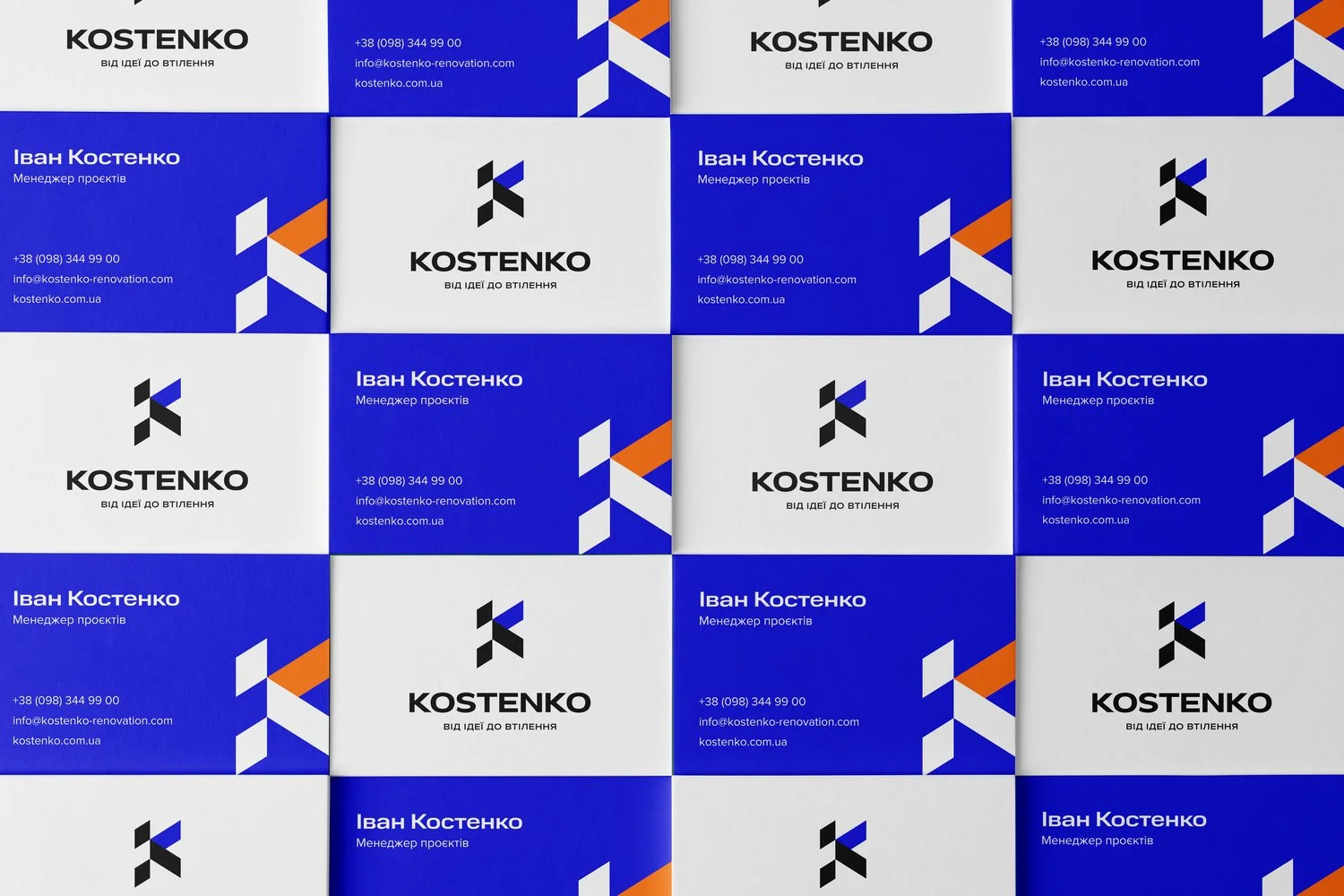 We developed a complete visual identity system for Kostenko, a professional renovation company with many years of experience. Our task was to translate their values — reliability, quality craftsmanship, and full-cycle service — into a cohesive and memorable brand language. The identity reflects their focus on working with skilled masters and trusted suppliers, as well as their ability to provide clients with high-quality materials and exclusive partner discounts. The design communicates confidence, clarity, and a structured approach that mirrors the way Kostenko manages every renovation project.